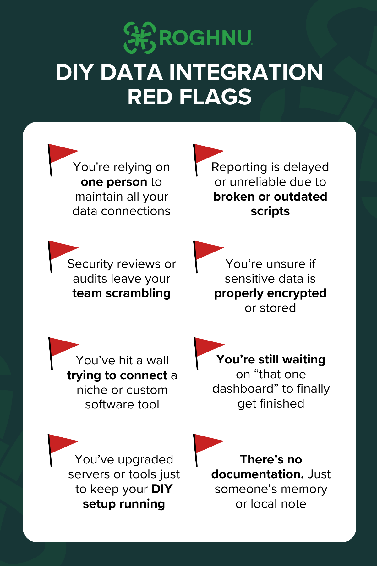 One of the biggest dangers with DIY data management is the risk of security blind spots and noncompliance with regulations like HIPAA, GDPR, or internal audit requirements. At Roghnu, we maintain SOC 2 Type II certification, which demonstrates strict controls for data security and privacy. This compliance alone can cost $20,000–$30,000 per year to maintain.